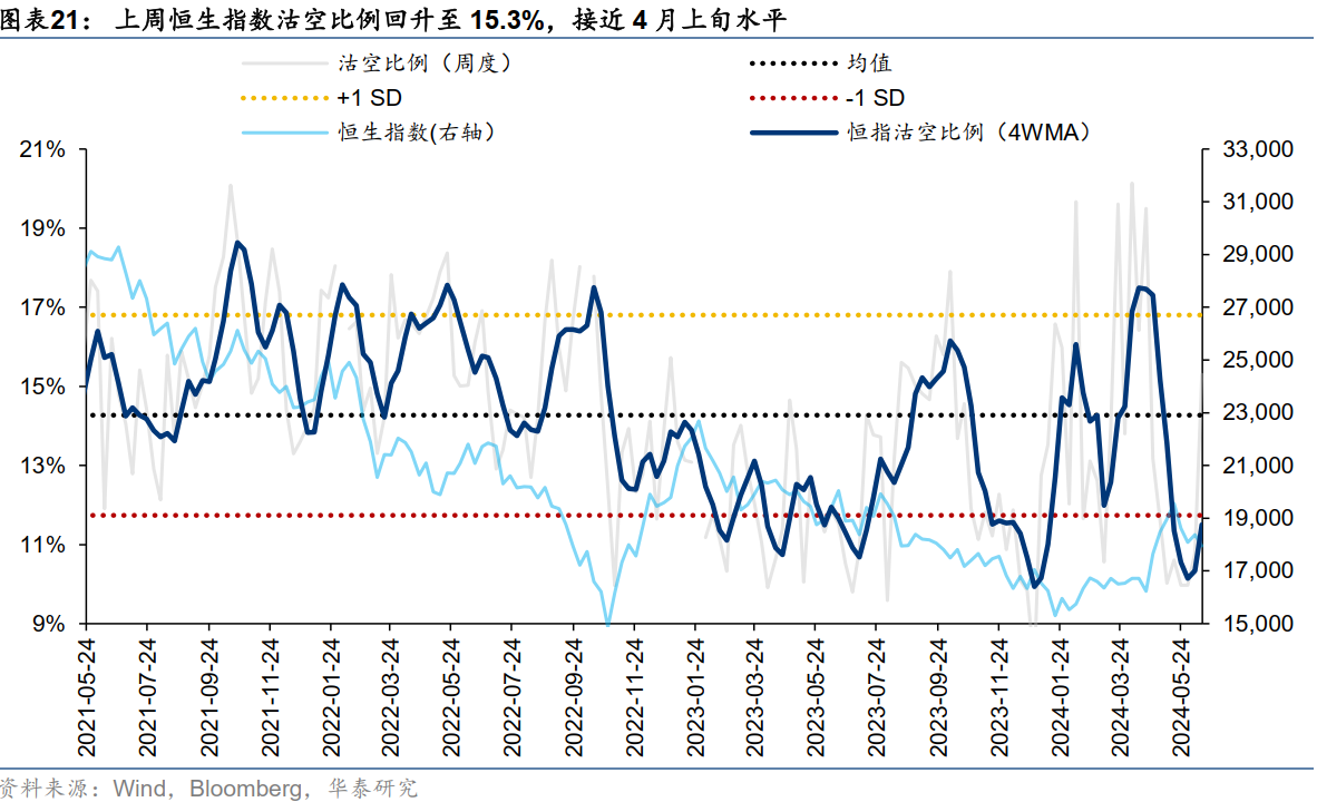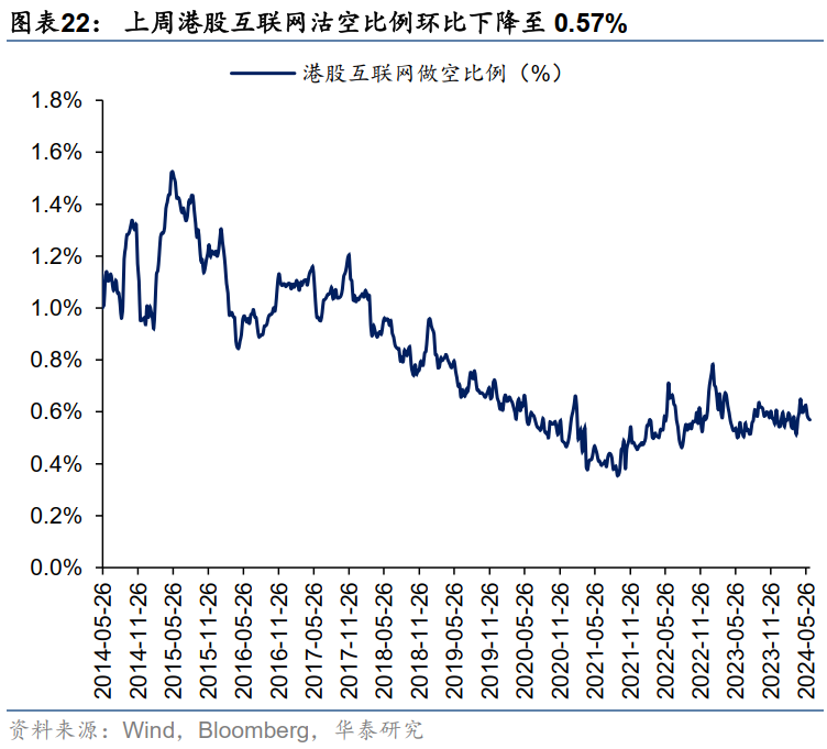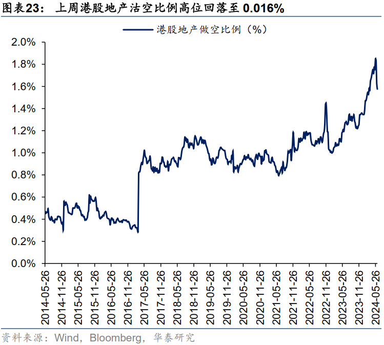 上周恒生指数沽空比例回升至15.3%,接近4月上旬水平。其中,港股互联网沽空比例环比下降至0.57%,港股地产高位回落(0.016%),但仍处于14年以来98.1%分位数。
