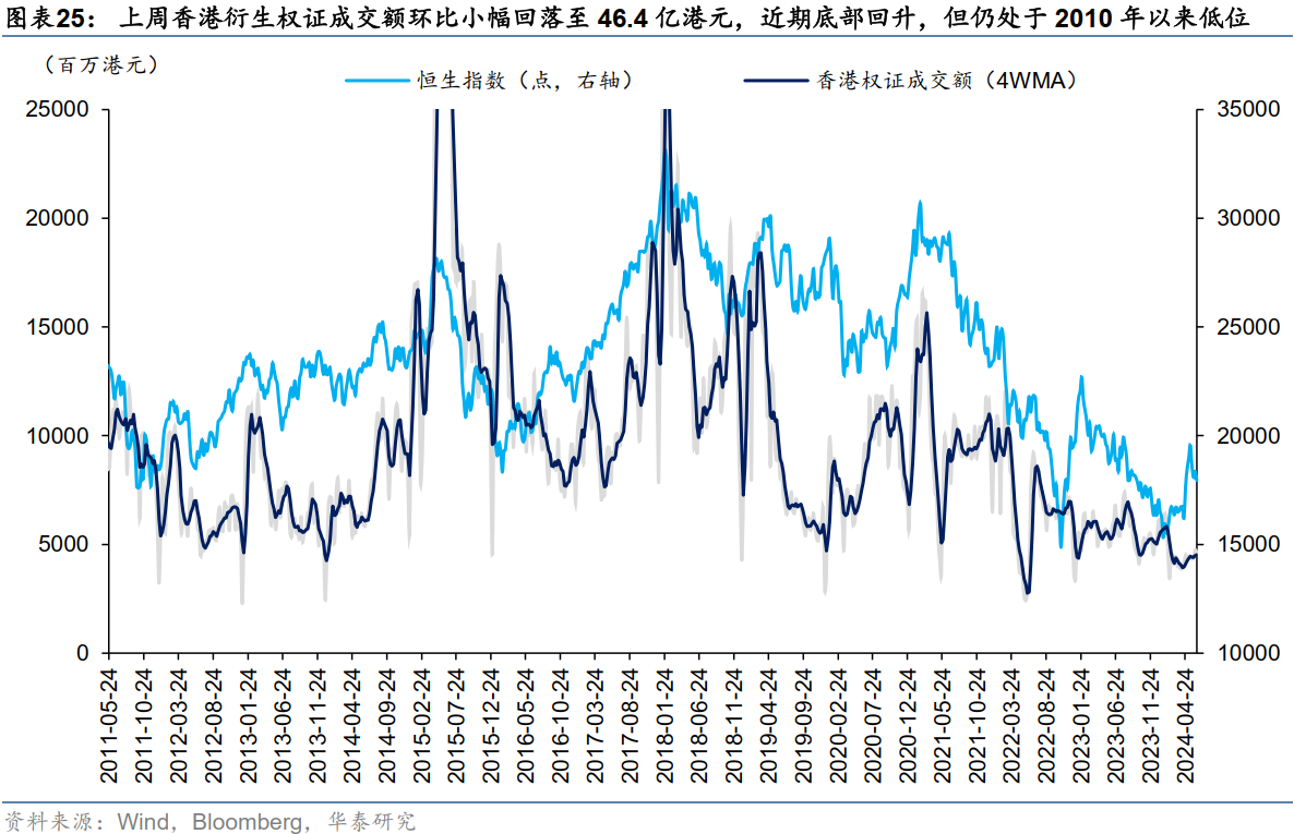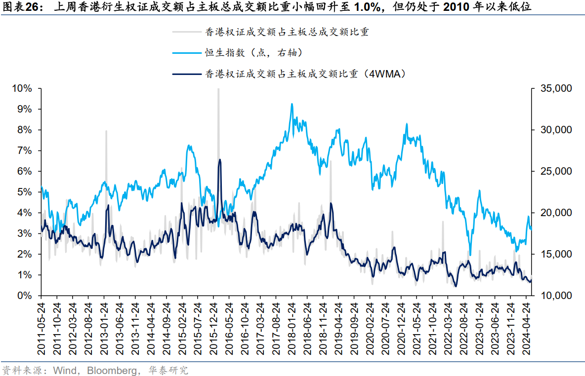 上周香港衍生权证成交额环比小幅回落至46.4亿港元(vs前一周47.4亿港元),权证成交额占主板总成交额比重小幅回升至1.0%,近期底部回升但仍处于2010年以来低位。