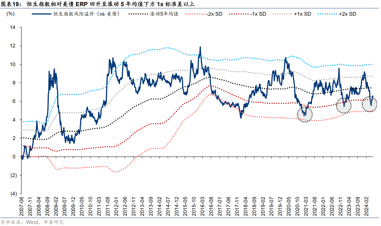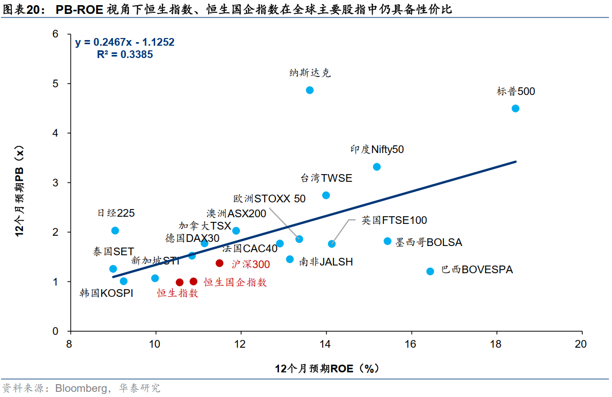 5月下旬阶段性高点以来,港股交易情绪有所消化,截至6.14恒生指数PETTM回落至9.3x,风险溢价(相对美债)回升至滚动5年均值以下1x标准差以上。从PB-ROE视角看,恒生指数、恒生国企指数全球主要股指中仍具备性价比。
