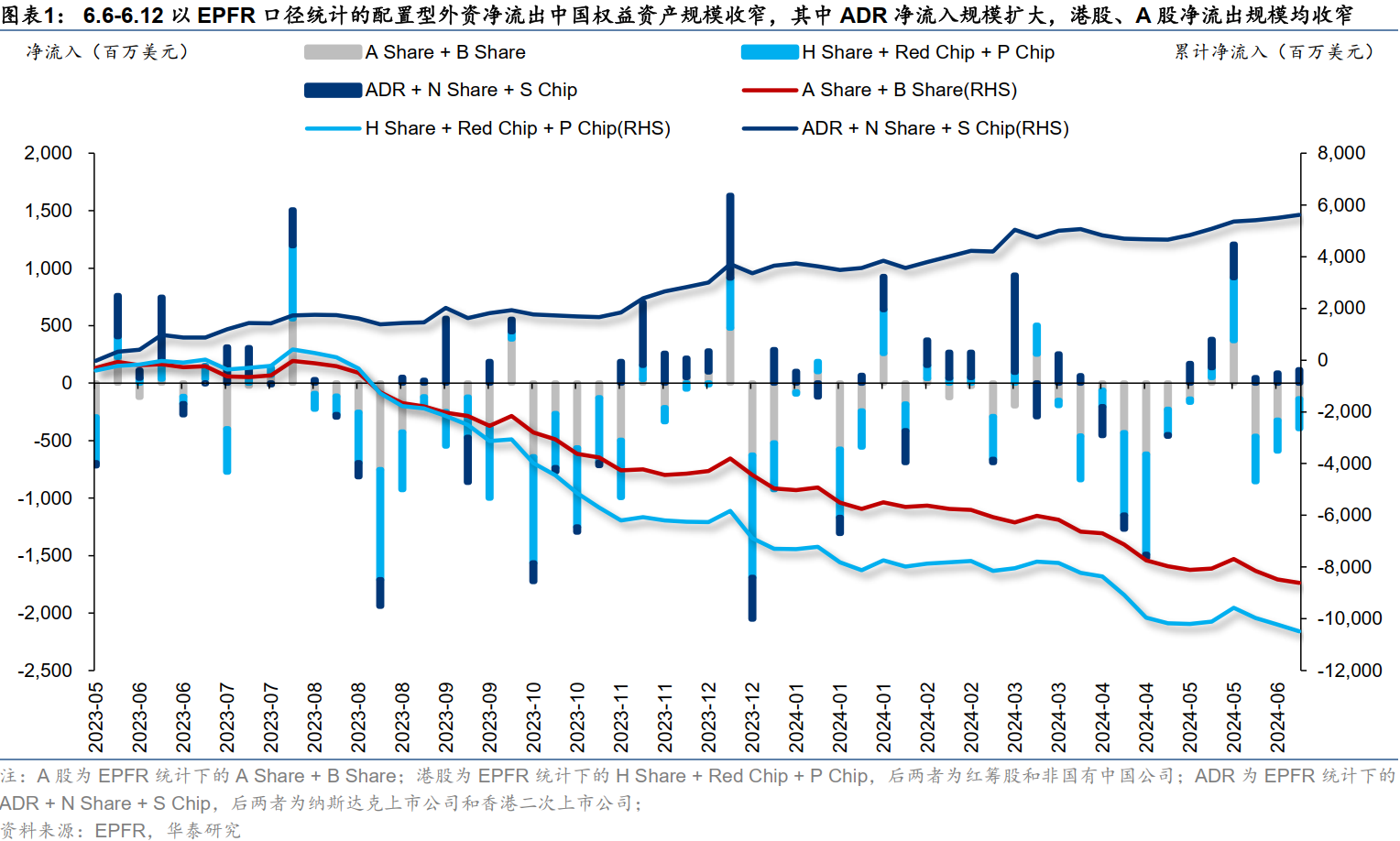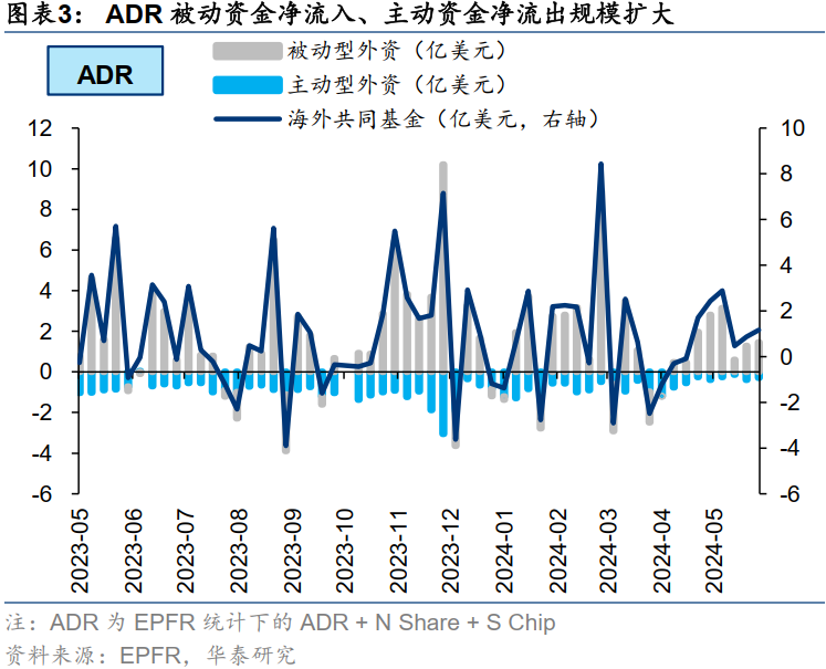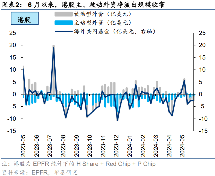 5月最后一周,主、被动外资大幅流出港股,但6月以来净流出规模有所收窄。上周港股主动外资净流出收窄至0.92亿美元(vs前一周净流出1.55亿美元),被动外资净流出1.64亿美元,净流出规模较前一周(净流出1.11亿美元)小幅增加,但相比5月最后一周(净流出3.51亿美元)有所收窄;ADR主动外资净流出收窄至0.30亿美元(vs前一周净流出0.39亿美元),被动外资净流入扩大至1.46亿美元(vs前一周净流入1.27亿美元),外资对ADR的配置更为积极。