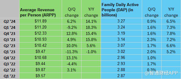 在运营指标方面,6月份家庭日活跃人数(DAP)平均同比增长7%,达到32.7亿人,超过市场预期的32.2亿人。广告曝光量增加了10%,每个广告的平均价格也增加了10%。家庭人均收入(ARPP)为11.89美元,同比增长14%。