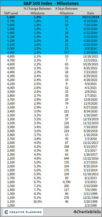 同时,这也是标普500指数历史上首度站上5800点整数关口。如下图所示,在今年迄今短短不到10个月时间里,标普500指数已经多达十次攻克了创纪录的百点整数大关……