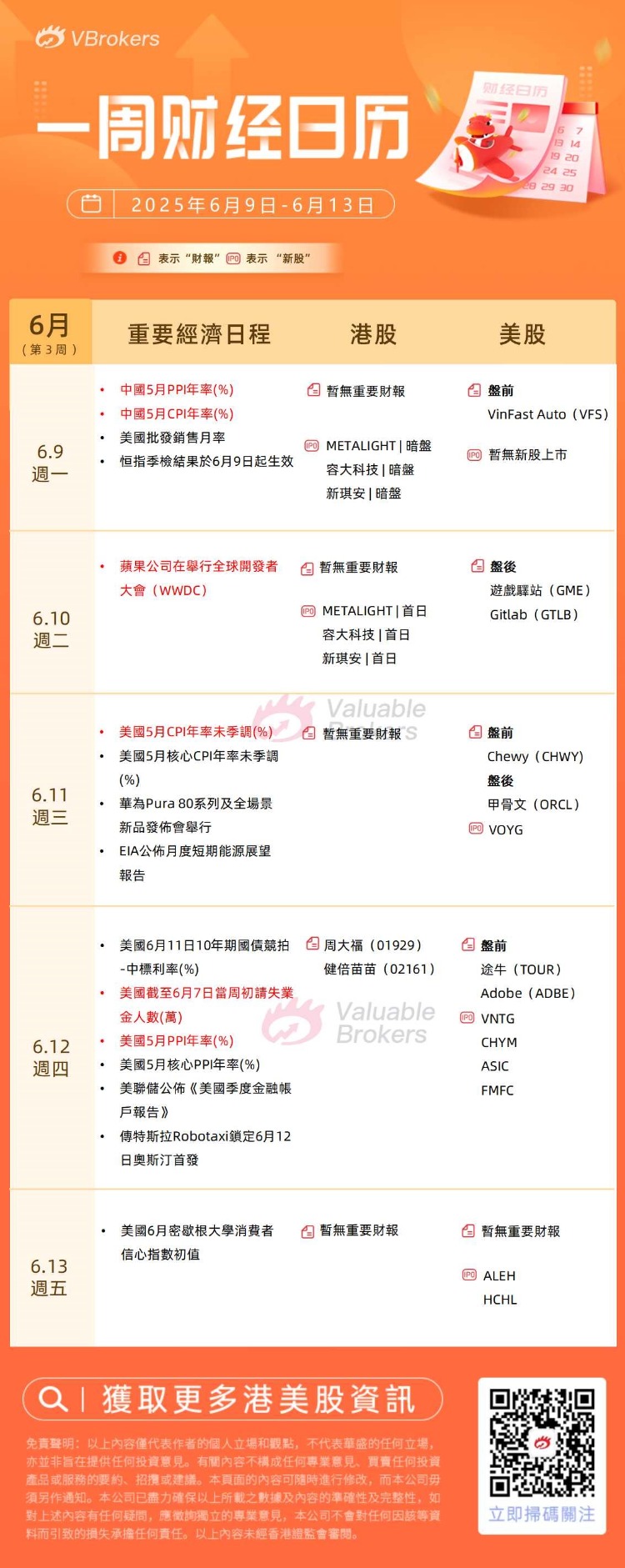 - 周一(6.9):恒指季检结果于6月9日起生效、中国5月PPI年率(%)、中国5月CPI年率(%)