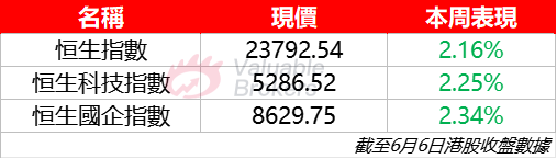 港股本周连续上攻,恒生指数周内涨幅2.16%,报23792.54点;恒生科技指数涨幅2.25%,报5286.52点;国企指数涨幅2.34%,报8629.75点。
