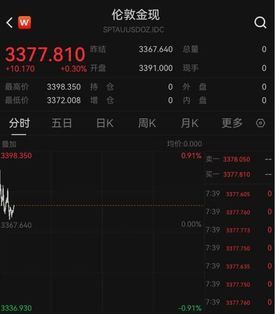 现货黄金一度涨0.9%,现涨0.3%,报3377.81美元/盎司。