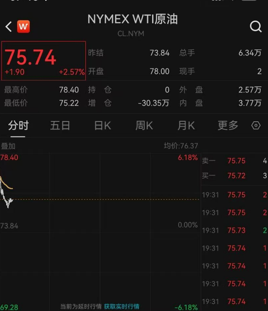 受中东局势的影响,周一(6月23日)亚市盘初,国际油价走高,美油一度涨超6%,布油一度涨超5%,此后油价涨幅缩小,截至发稿,美油涨幅为2.57%,报75.74美元/桶,布油涨幅为2.5%,报77.37美元/桶。