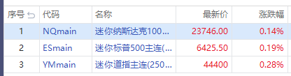 美股三大指数期货盘前小幅走高,纳指期货 $NQmain 涨0.14%,标普500期货 $ESmain 涨0.19%,道指期货 $YMmain 涨0.28%。