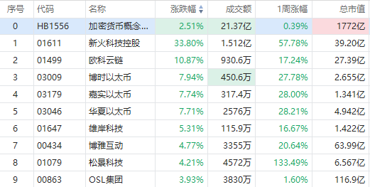 加密货币股集体走强,新火科技控股涨超33%,欧科云链涨超10%。