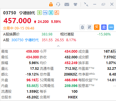 华盛资讯9月15日讯,宁德时代港股涨超5%,A股涨超7%,大摩称其估值是“行业中最便宜的”