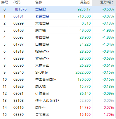 9月18日,港股黄金股延续回调行情,其中,老铺黄金跌超3%,赤峰黄金、周六福跌近2%,招金矿业、山东黄金跌约1%,紫金矿业跌约0.5%。