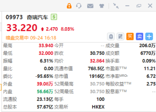 华盛资讯9月24日讯,中国第二大自主品牌车企奇瑞汽车正在暗盘交易,截至发稿涨8.03%,报33.22港元/股,中签一手账面浮盈247港元,最新总市值超1900亿港元。该股预计将于9月25日正式挂牌上市,配售结果将于今日晚间披露。