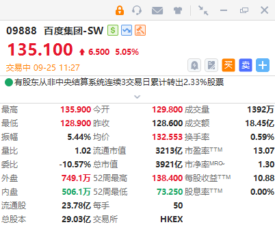 华盛资讯9月25日讯,百度集团-SW(9888.HK)拉升涨超5%,报135.1港元;百度集团年内累涨63%。