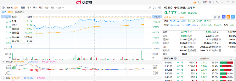 中芯国际涨超12%,宏光半导体一度大涨近5%,上海复旦和华虹半导体皆一度涨超4%。衍生品市场更是大爆发,中芯瑞银六三牛M暴涨超100%;中芯法兴六六牛A、中芯汇丰六七牛C、中芯法巴六二牛R皆大幅飙涨。而且成交金额也不低,中芯瑞银六三牛M早盘的成交金额就超过了1200万港元。