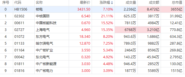 华盛资讯10月3日讯,核电股涨幅居前,截至发稿,中核国际涨21%,中国核能科技、上海电气涨超15%,东方电气涨超8%。