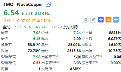 华盛资讯10月7日讯,美国政府宣布将收购加拿大矿产勘探公司 Trilogy Metals ( $TMQ )10%的股份,作为一项3560万美元投资计划的一部分,旨在保障阿拉斯加州的关键能源与采矿项目。受此消息提振,Trilogy Metals美股盘初一度涨超260%,现涨幅收窄至约210%,成交额超6亿美元。