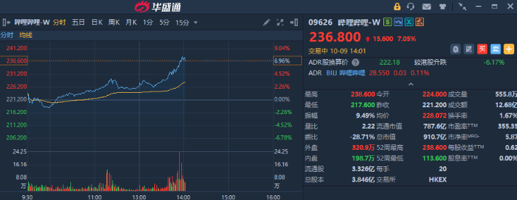 华盛资讯10月9日讯,港股部分科网股午后涨势扩大,其中哔哩哔哩大涨超7%,美图公司涨超5%。