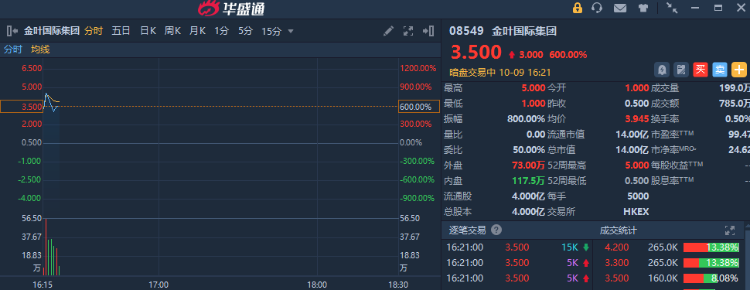 港股金叶国际集团正在暗盘交易中,此前一度涨超800%,创年内新股涨幅纪录!截至发稿,金叶国际集团现涨600%,报3.5港元/股,中签一手账面浮盈15000港元,最新总市值约14亿港元。该股预计将于10月10日正式挂牌上市,配售结果将于今日晚间披露。