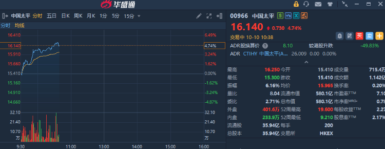 华盛资讯10月10日讯,港股保险板块集体走强,中国太平涨近5%,新华保险涨逾4%。