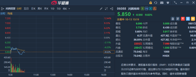 华盛资讯10月13日讯,港股苹果概念股震荡走弱,鸿腾精密一度跌超10%,现跌约9%。