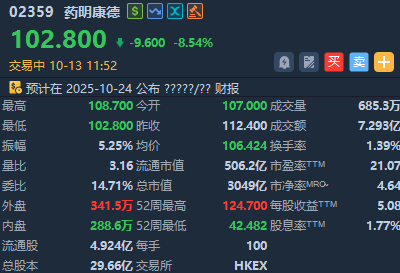 华盛资讯10月13日讯,港股医药外包概念股走弱,截至发稿,康龙化成跌近9%。