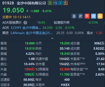 华盛资讯10月13日讯,港股博彩概念股午后持续走弱,截至发稿,金沙中国有限公司跌超5%,新濠国际发展跌超4%,永利澳门、汇彩控股、美高梅中国跌超3%,银河娱乐跌超2%。