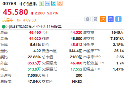 消息面上,香港交易所信息显示,摩根大通在中兴通讯H股的持股比例于10月08日从6.74%升至6.97%。