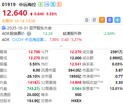 华盛资讯10月14日讯,港口运输概念股走高,截至发稿,中远海控涨5%,中远海发涨近4%,东方海外国际涨近3%。
