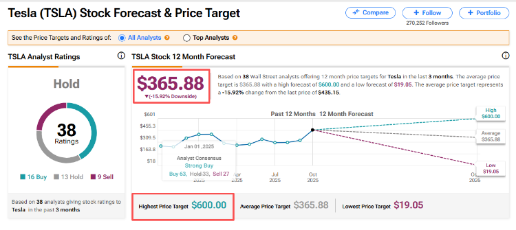 据TipRanks最新数据显示,华尔街大行对特斯拉目标价分歧较大,仅有42%的机构给予“买入”评级,当前平均目标价为365.88美元低于市价,最高目标价则为600美元/股。
