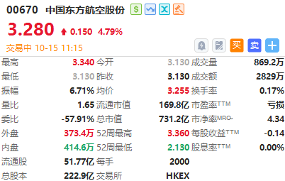 华盛资讯10月15日讯,港股三大航空股拉升,中国东方航空股份、中国国航涨近5%,中国南方航空股份涨超3%
