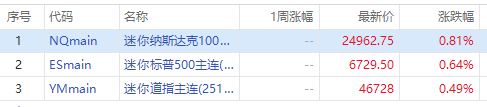 美股三大指数期货盘前齐跌,纳指期货 $NQmain 涨0.81%,标普500期货 $ESmain 涨0.64%,道指期货 $YMmain 涨0.49%。