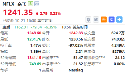 三季度奈飞营收同比增长加快至逾17%,符合分析师预期;广告收入创单季新高;净利润和EPS盈利较预期低至少14%;营业利润率回落至28.2%,巴西税务纠纷相关支出6.19亿美元导致利润率下降5个百分点,若无此支出,利润率本可高于公司指引31.5%。奈飞预计税务纠纷不会对未来业绩产生重大影响,但鉴于税务问题,将今年营业利润率指引从30%下调至29%;预计今年广告收入翻一倍多,全年自由现金流指引提高9%。受业绩影响,奈飞盘后跌逾6%,报1162.01美元。