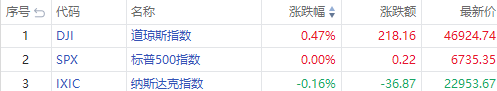 截至收盘,道琼斯指数涨0.47%,再创历史新高;标普500指数平收;纳斯达克指数跌0.16%。可口可乐和3M在最新财报超出华尔街预期后,分别上涨4.1%和7.7%,支撑了道指的上涨。热门中概股多数收跌,阿里巴巴跌3.92%,京东跌2.75%,拼多多跌0.65%,蔚来跌3.68%,理想汽车跌2.35%,哔哩哔哩涨5.84%,百度跌2.44%,网易跌0.65%,小马智行跌1.99%。