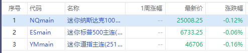 美股三大指数期货盘前齐跌,纳指期货 $NQmain 跌0.12%,标普500期货 $ESmain 跌0.06%,道指期货 $YMmain 跌0.16%。