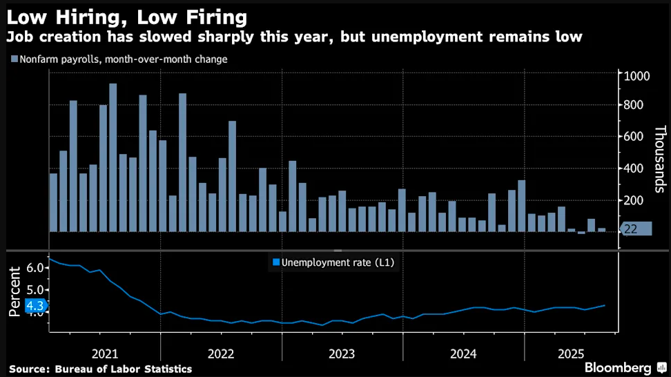 今年前八个月,美联储政策制定者曾一直保持按兵不动,以等待评估关税及其他政策调整对经济的影响。今年夏季招聘大幅放缓后,官员们于9月决定将基准利率下调25个基点。在当月发布的点阵图中,他们预测年底前还将再降息两次。