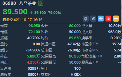 华盛资讯10月27日讯,港股八马茶业正在暗盘交易中,截至发稿涨79.00%,报89.50港元/股,中签一手账面浮盈3950.0港元,最新总市值超76.08亿港元。该股预计将于10月28日正式挂牌上市,配售结果将于今日晚间披露。
