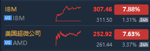 消息一出,截至上周五收盘,IBM股价大涨7.88%,市值增长了约210亿美元;同时,AMD也有7.63%的强劲涨幅。