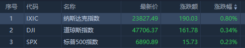 截至周一收盘,美股三大指集体大涨,纳指涨0.8%,报23827.49点;道指涨0.34%,报47706.37点;标普500指数涨0.23%,报6890.89点。