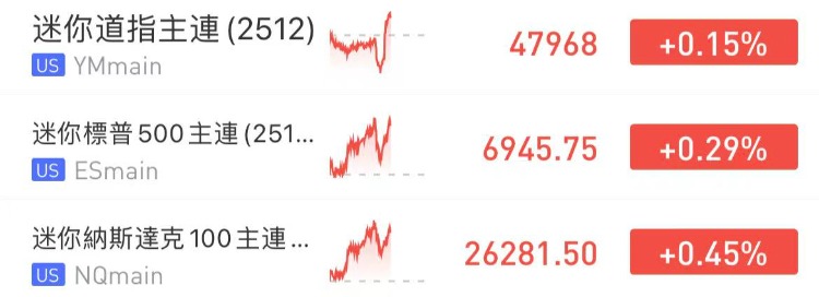 美股三大指数期货盘前上涨,纳指期货 $NQmain 涨0.45%,标普500期货 $ESmain 涨0.29%,道指期货 $YMmain 涨0.15%。