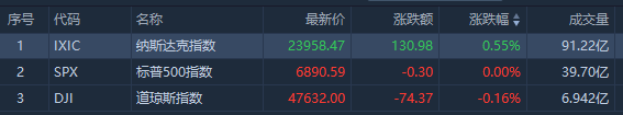 截至昨日收盘,美股三大指数涨跌不一,纳指涨0.55%,报23958.47点;道指跌0.16%,报47632点;标普500指数平收,报6890.59点。