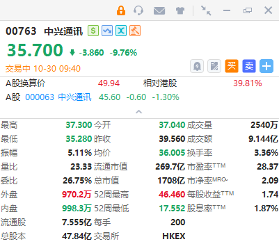 华盛资讯10月30日讯,中兴通讯重挫近10%,Q3财报公司应收账款较多,增收不增利。