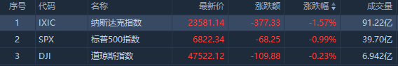截至昨日收盘,美股三大指数集体下跌,道琼斯指数跌0.23%,报47522.12点;标普500指数跌0.99%,报6822.34点;纳斯达克综合指数跌1.57%,报23581.14点,终结了连创新高的势头。