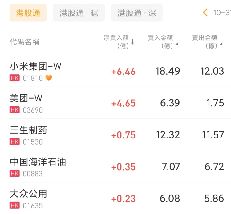 小米集团-W、美团-W、三生制药分别获净买入6.46亿港元、4.65亿港元、7,546万港元;