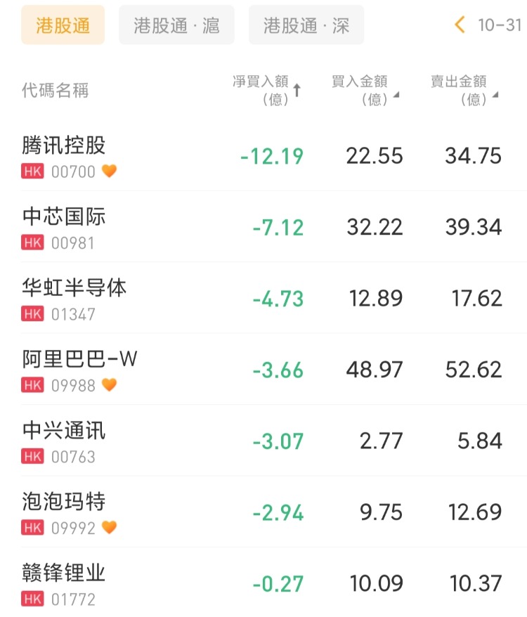 腾讯控股、中芯国际、华虹半导体分别遭净卖出12.19亿港元、7.12亿港元、4.73亿港元。