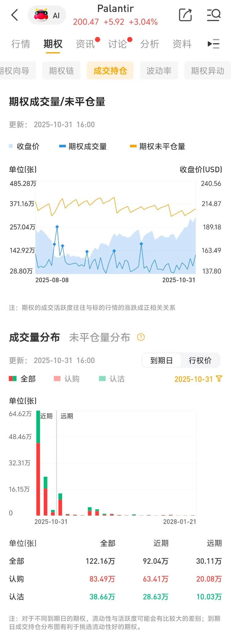 Palantir $PLTR :上周五涨3.04%,当日期权成交总量达122万张,较前一日增加54.85万张,环比前一日放量0.81倍。其中看涨期权成交占比约68.4%,未平仓量有347万张。期权链:Palantir PLTR 期权链