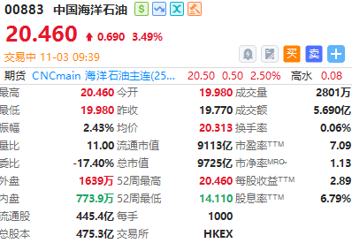 华盛资讯11月03日讯,港股石油概念股盘初走高,中国海洋石油、中国石油股份涨超3%,中国石油化工股份涨近1%。