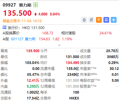 华盛资讯11月4日讯,港股”豪华新能源车企“赛力斯正在暗盘交易中,截至发稿涨3.04%,报135.5港元/股,中签一手账面浮盈400港元,最新总市值超2300亿港元。该股预计将于11月5日正式挂牌上市,配售结果将于今日晚间披露。