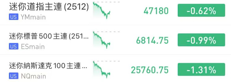 美股三大指数期货盘前齐跌,纳指期货 $NQmain 跌1.31%,标普500期货 $ESmain 跌0.99%,道指期货 $YMmain 跌0.62%。