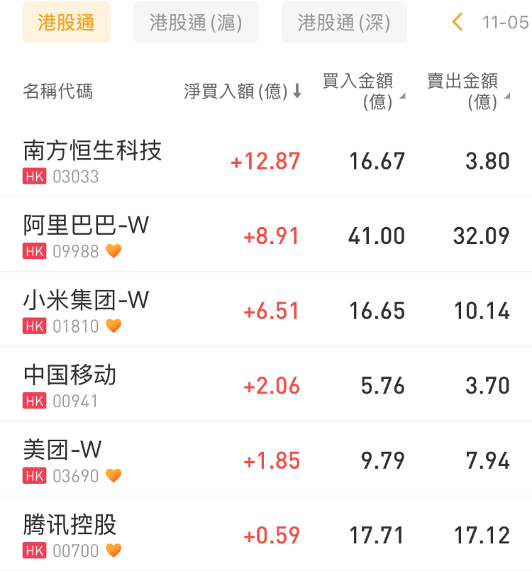 南方恒生科技、阿里巴巴-W、小米集团-W分别获净买入12.87亿港元、8.91亿港元、6.51亿港元;