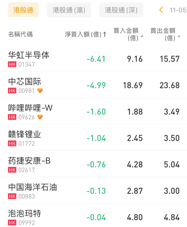华虹半导体、中芯国际、哔哩哔哩-W分别遭净卖出6.41亿港元、4.99亿港元、1.6亿港元。