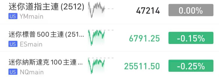 美股三大指数期货盘前微跌,纳指期货 $NQmain 跌0.25%,标普500期货 $ESmain 跌0.15%,道指期货 $YMmain 持平。